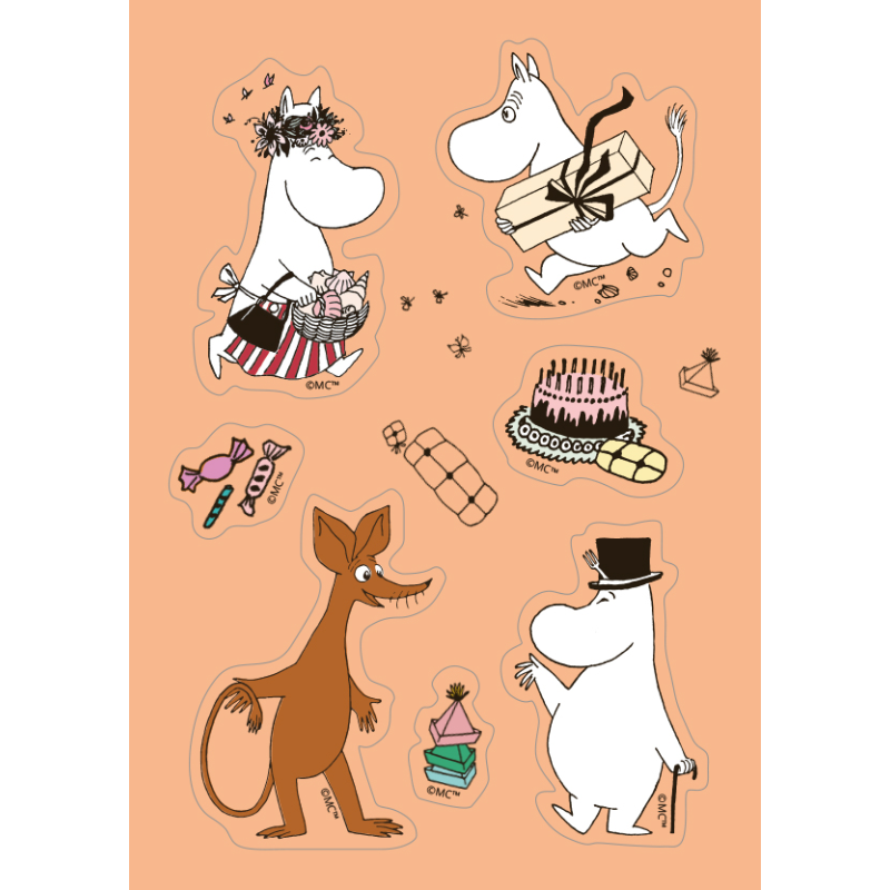 Finnish sticker card for Moomin celebration! Seven adorable stickers: Moominmamma, Moomintroll, Moominpappa, Sniff, cake, candies. Peach-colored.