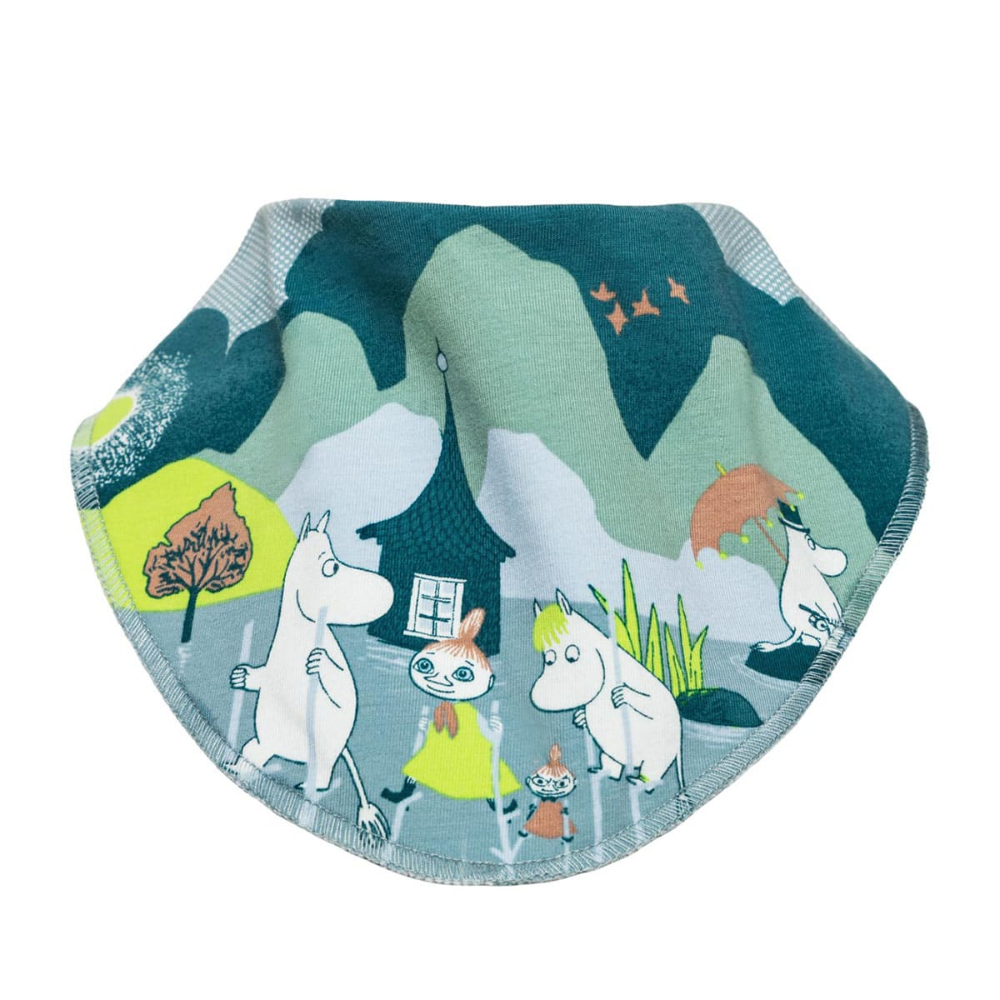 A charming multi-coloured Martinex Moomin Flood Scarf that brings the enchanting stories of Moominvalley into the daily lives of the youngest family members! This sweet baby bandana-style scarf fastens with snaps and features a pleasant triangular shape with convenient adjustability thanks to two snap fasteners, making it versatile for use as both a drool bib and a neck warmer. The scarf's base colour plays with shades of blue with neon green details, and it's adorned with the atmospheric Flood design, evoking the adventures of Moomintroll and the Comet. Its reversible design and delightfully soft, ecological organic cotton jersey material ensure comfort and easy care. Manufactured according to Oeko-Tex standards, you can be confident in its safety. A perfect accessory for little Moomin fans!