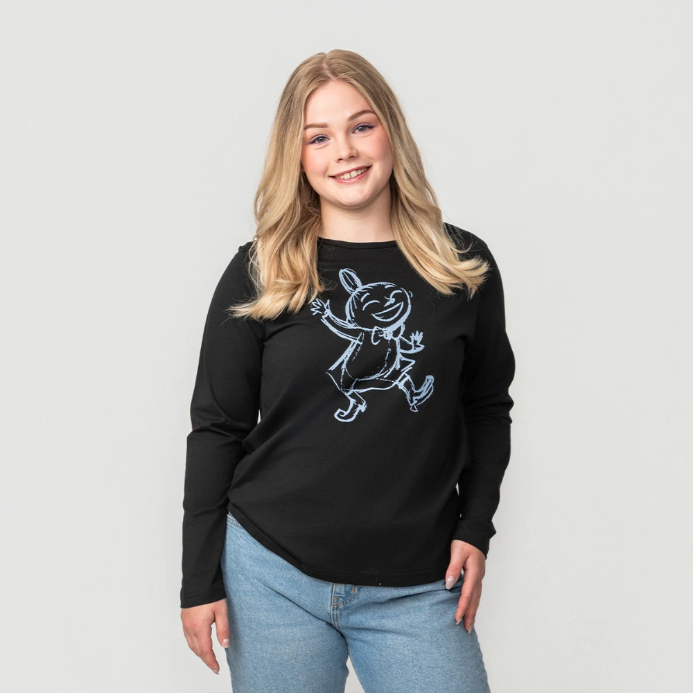 Discover the delightful Martinex Moomin Elena Shirt, bringing a touch of Moominvalley's cheerful energy to your daily life! This minimalist black, long-sleeved shirt captivates with its classic straight fit and comfortable cotton material that feels wonderful against the skin. The chest of the shirt is adorned with a sketch from the Moominvalley animation series featuring a temperamental, but now very cheerful-looking Little My – an image sure to bring a smile to your face! A carefully finished neckline and soft print make this shirt a stylish and comfortable choice for various occasions. Manufactured according to Oeko-Tex standards, you can trust its quality and safety. Perfect for everyday wear and relaxed moments.
