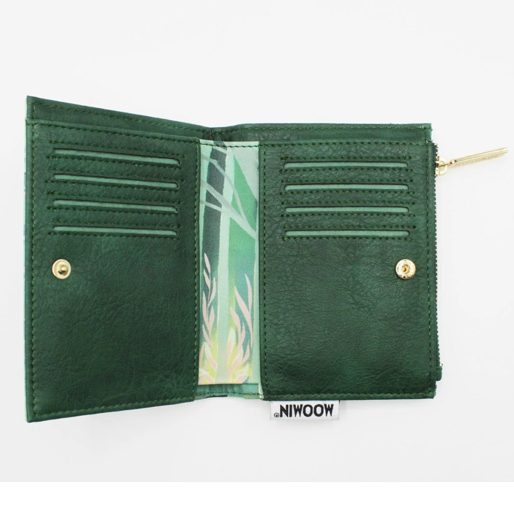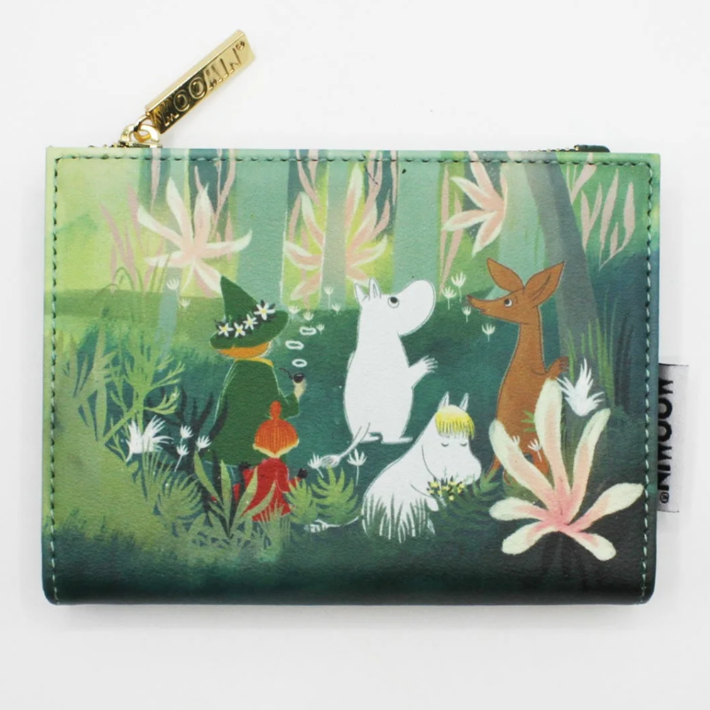 This charming House of Disaster Moomin purse brings the serene atmosphere of the forest with you wherever you go. The illustration on the purse depicts Moomintroll and his friends exploring the lush greenery of the forest. Inside, there is a zipped coin pocket with a stylish Moomin logo puller. The interior also features a cash pocket and eight card slots. The reverse side of the purse is adorned with a beautiful golden Moomin logo.