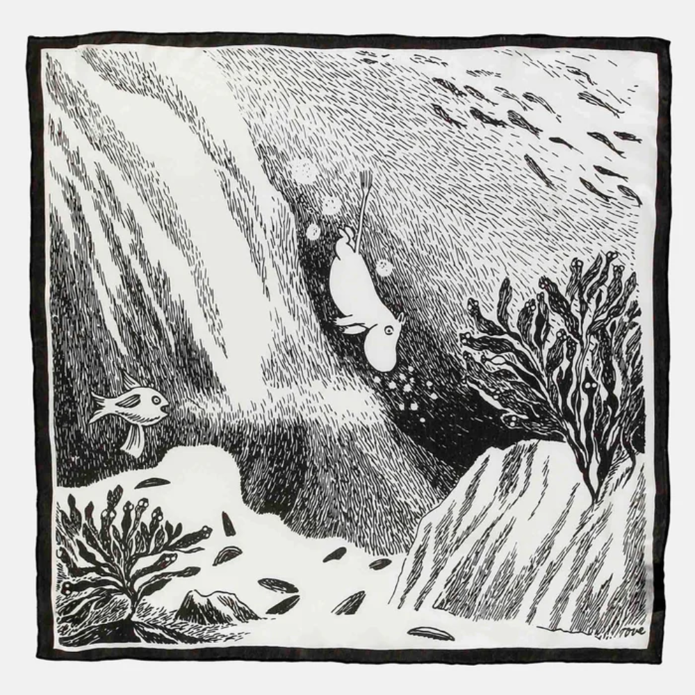 This luxurious and stylish Lasessor silk scarf is a perfect addition to your wardrobe. Made from 100% silk, it feels incredibly soft and smooth against the skin. The scarf's pattern, based on Tove Jansson’s original artwork, depicts Moomintroll adventuring in an underwater world. The design is a nod to Finnish heritage and adds a touch of playful and timeless charm to your outfit.