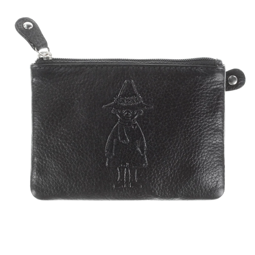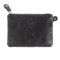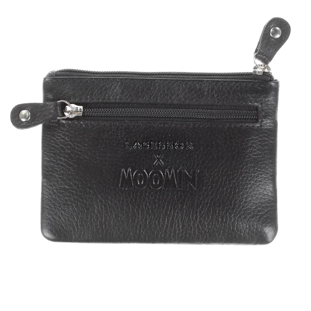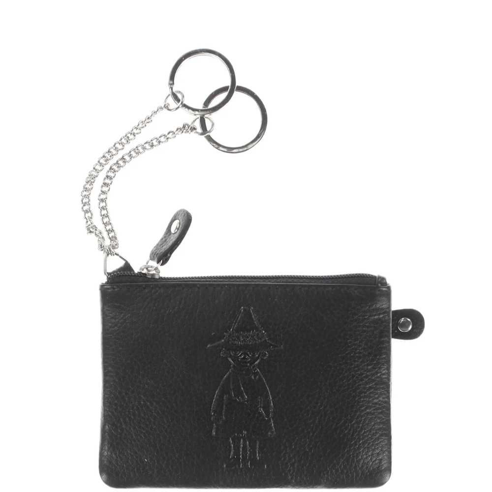 This compact and stylish black coin purse is made from soft nappa leather. It's a practical accessory that can hold your coins, keys, and cards. The purse features two zippered compartments and a metal chain on the inside for securely attaching it to a bag or backpack.