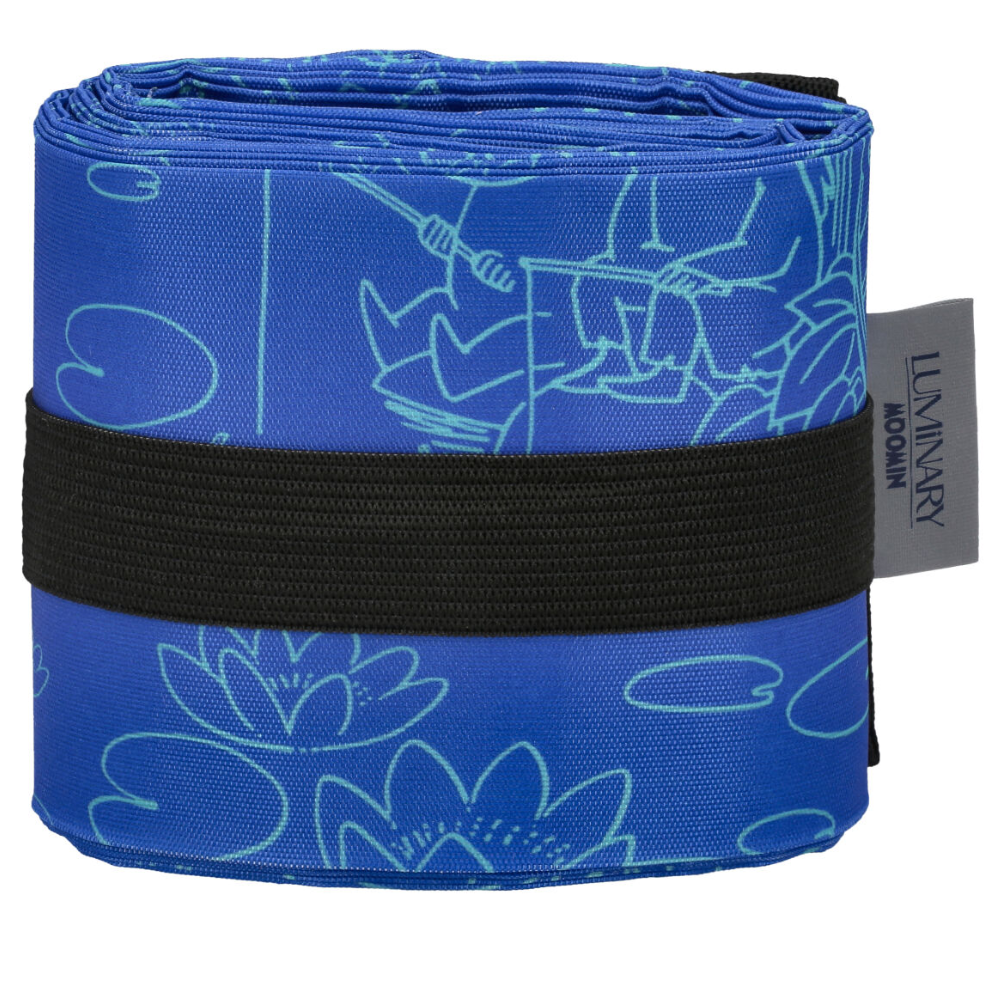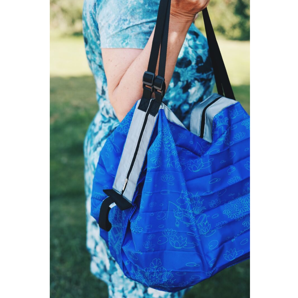 This Luminary Moomin bag is a versatile and eco-friendly choice that you can easily take with you anywhere. It's made from a lightweight and durable material that automatically rolls itself up when you pull on the edges. The upper part of the bag and the handles feature reflective details. The charming pattern shows Little My sitting on a tree branch while Moomintroll and Snufkin are fishing. The adjustable handles make it perfect for shopping, the gym, or traveling.