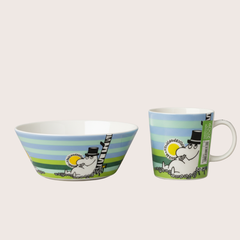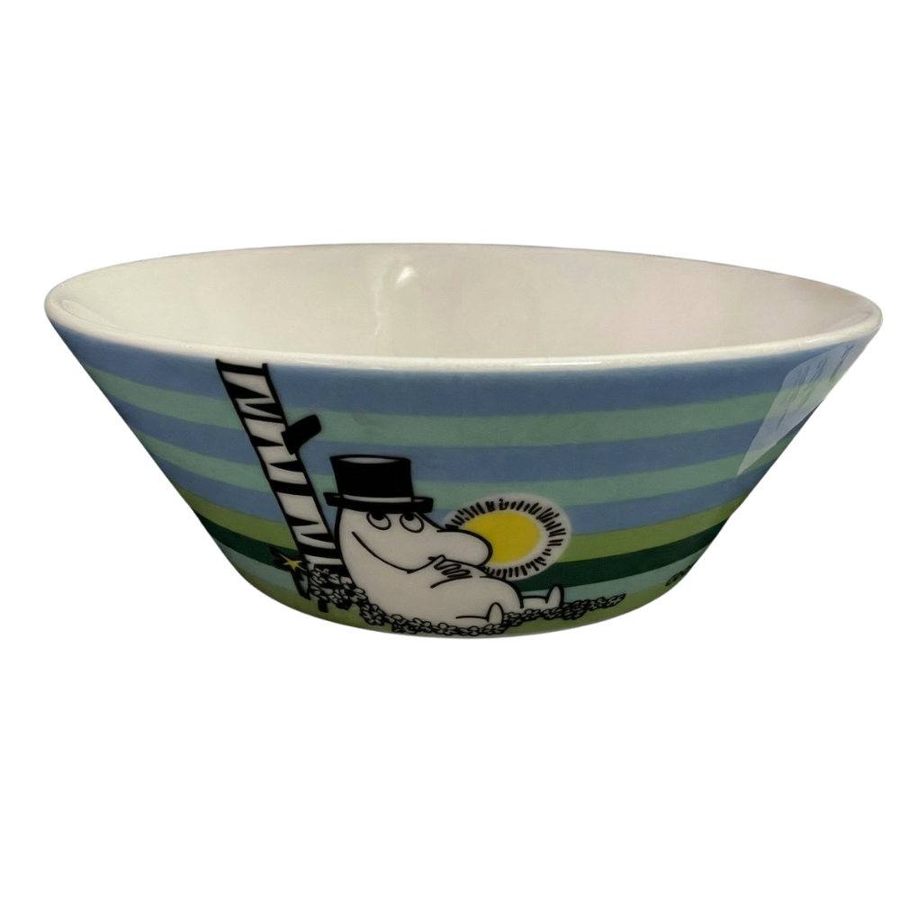 Bring a summery, relaxed feeling to your home with this Arabia Moomin Bowl, known as Siesta. The bowl was Arabia's summer seasonal product in 2009. Its fresh, striped illustration takes your thoughts to sunny days. In the picture, Moominpappa (or more accurately, Moomintroll wearing Moominpappa's hat, as adapted by Tove Slotte from Tove Jansson's comics) enjoys a summer day in the shade, leaning against a ladder, surrounded by trees and sunny rays.