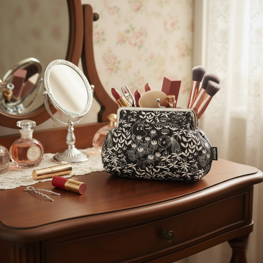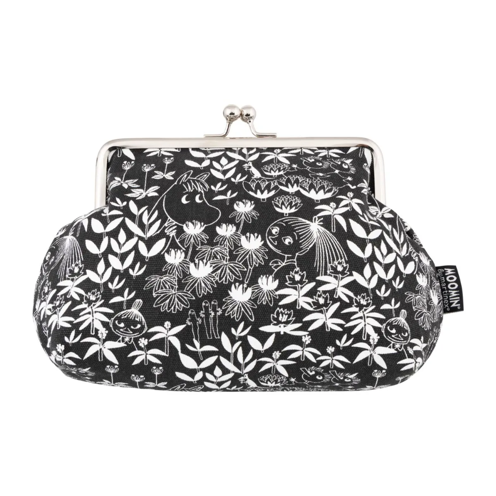 The pouch features white-drawn primroses and Moominvalley residents on a black background.
