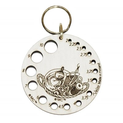 Funny Moomin-themed wooden knitting needle gauges. The gauge is made from Finnish birch and its front has been handled with white wood wax and the backside is covered with black wax. With these you can easily measure the sizes of your knitting needles.