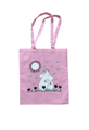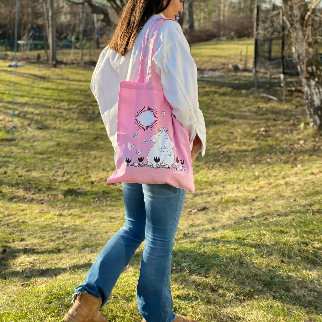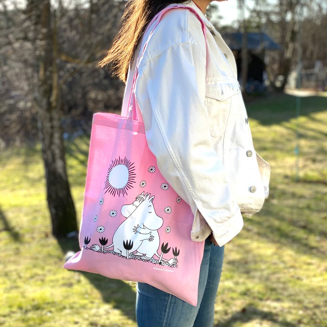 Beautiful light pink shopper fabric bag with illustration of Moomintroll and Snorkmaiden hugging.